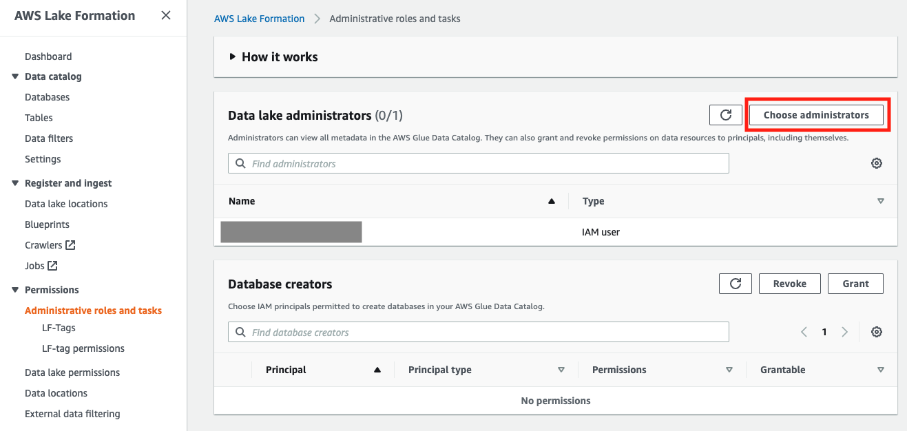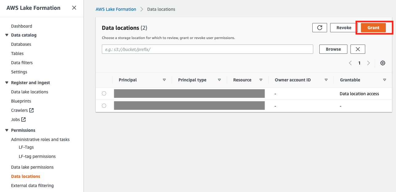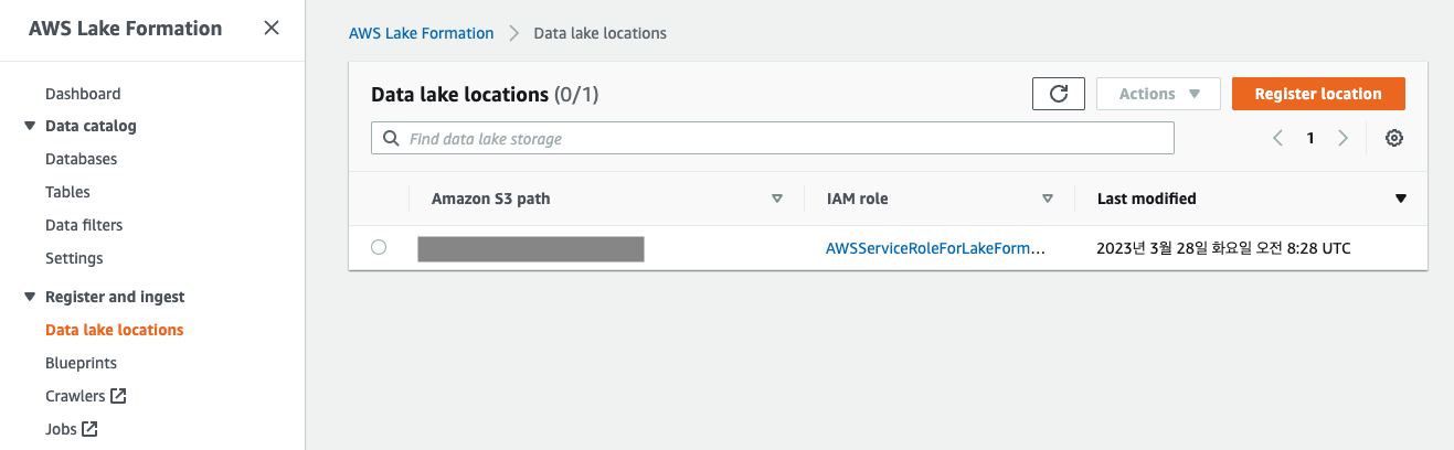 이전 단계에서 S3를 Lakeformation에 등록하여 인식을 시켰다면