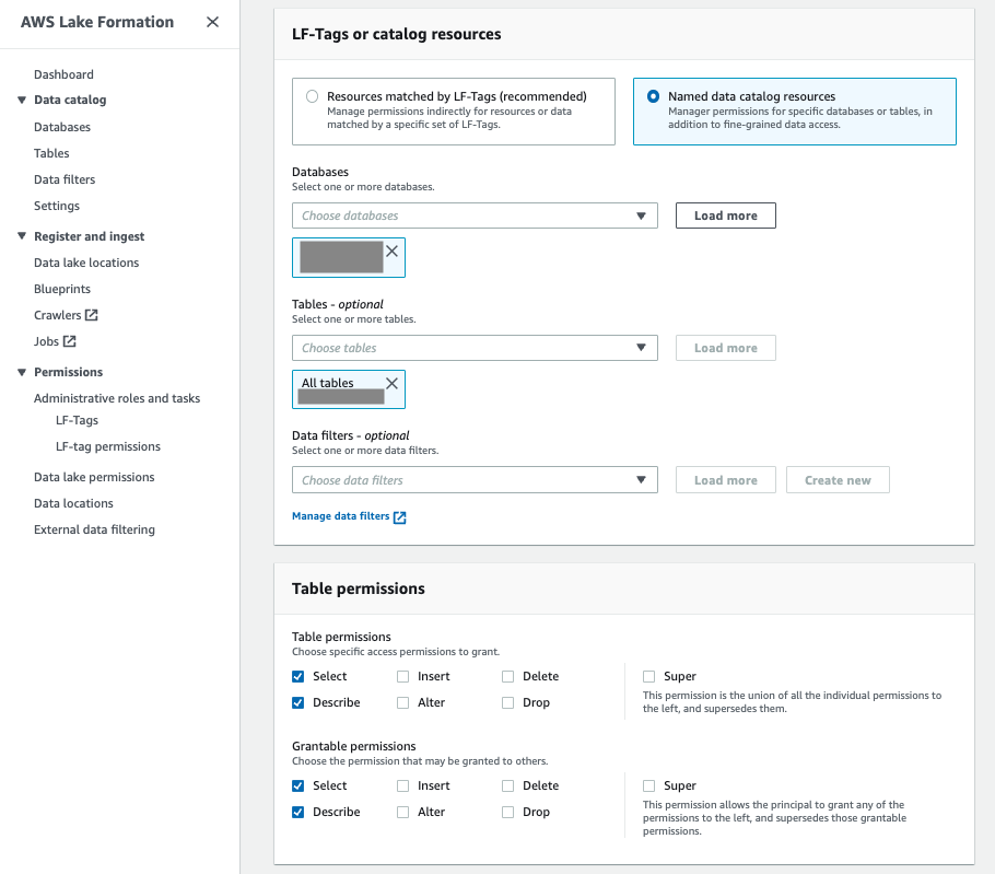 공유할 db, table을 선택 한 후 Table permissions를 지정한다.