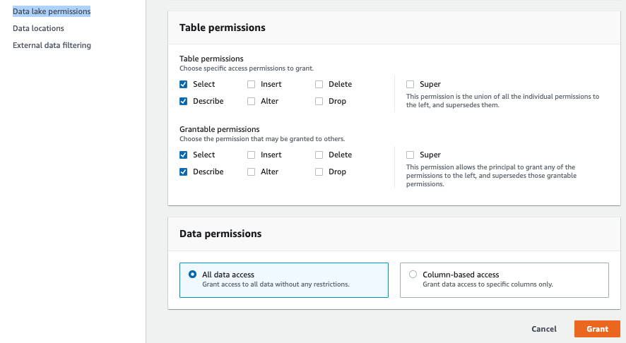 Permission->Data lake permissions->Grant버튼 클릭 하여