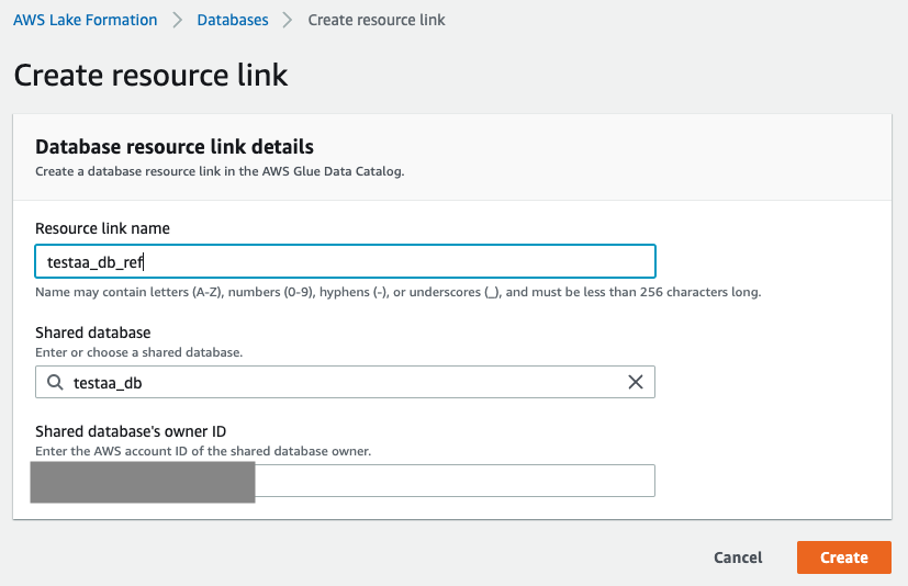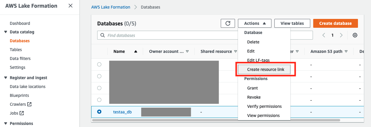 BB계정의 Lakeformation에 들어가 공유된 외부 Database의 리소스링크를 만든다.