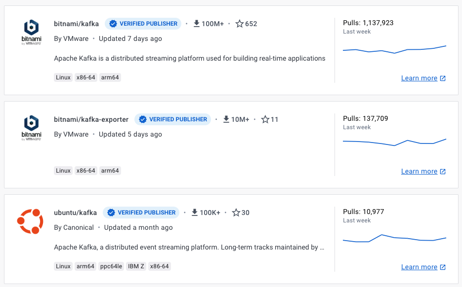 도커 이미지는 bitnami image를 사용한다. confluentinc image도 있지만 bitnami가 pull 횟수가 가장 많다.