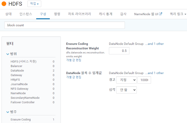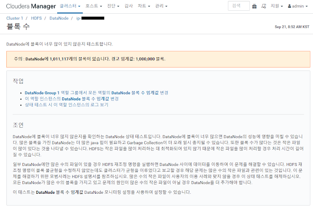 CDM에서 HDFS->구성에 들어가 해당 "DataNode 블록 수 임계값"을 더 높게 설정한다.