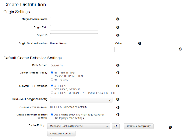 AWS CloudFront → Create Distribution → Web섹션 Get Started → Origin Domain Name에 만든 S3 Name으로 입력한다.