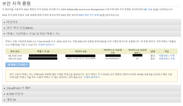 - 보안자격증명 key, secret 얻기