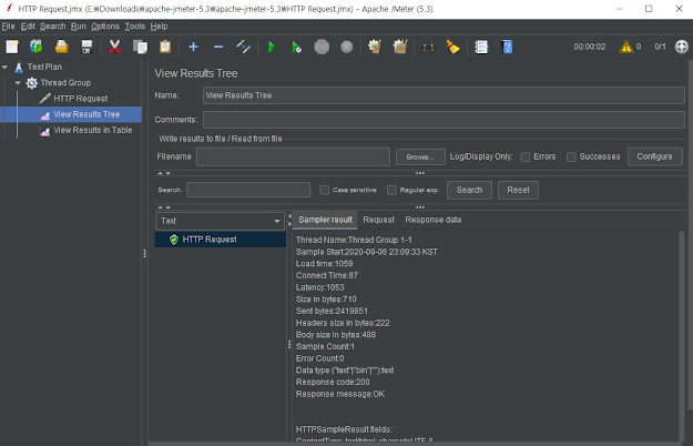 * Http Request로 파라미터를 넣고 실행하고 View Results Tree / View Results in Table로 해당 결과를 확인한다.
