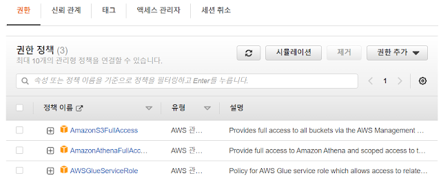 권한 탭에서 AAAA계정이 접근할 서비스 추가 (S3, Athena, Glue)