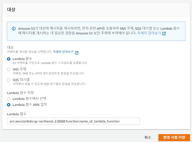 2. Amazon S3에서 호출할 Lambda 함수의 이름을 선택합니다.