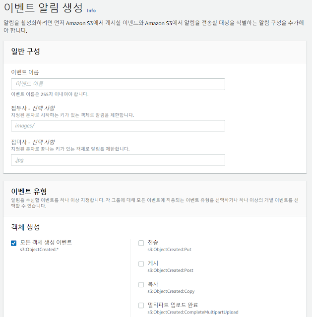 - (선택 사항) 접두사를 기준으로 이벤트 알림을 필터링하려면 접두사(Prefix)를 입력합니다. 예를 들어 특정 폴더에 파일이 추가될 때만 알림을 받도록 접두사 필터를 설정할 수 있습니다(예: images/).